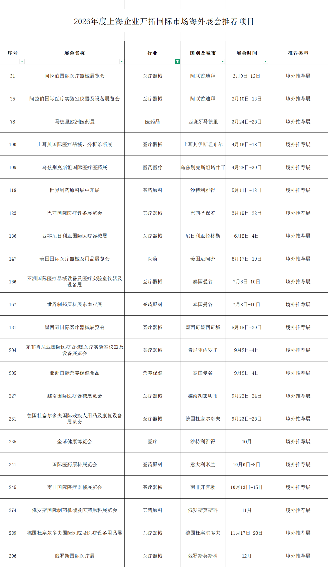 近日,上海市商务委员会正式发布2026 年度重点推荐海外展会项目名单,其中医疗医药类 22 场重磅入选,为计划出海的中国医疗企业,送上“政策护航 + 市场拓新”的双重红利!